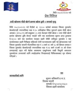 बेलकोटगढी नगरपालिका वडा नम्बर १० तादिखोला स्थित घुमाउने दहमा पौडी खेल्ने क्रममा दुई जनाको मृत्यु भएको जिल्ला प्रहरी कार्यालय नुवाकोटले जनाएको छ ।