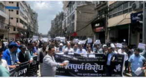विलासी कर र भ्याट संरचनाको विरोधमा सुनचाँदी व्यवसायी तथा कालीगढहरूको न्युरोडमा प्रदर्शन।