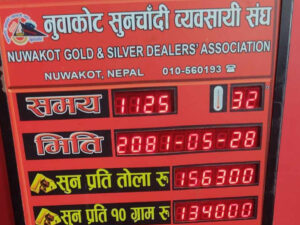 नुवाकोट सुनचाँदी व्यवसायी महासंघका अनुसार आज छापावाल सुन प्रतितोला एक लाख ५६ हजार ३00 रूपैयाँमा कारोबार भइरहेको छ।